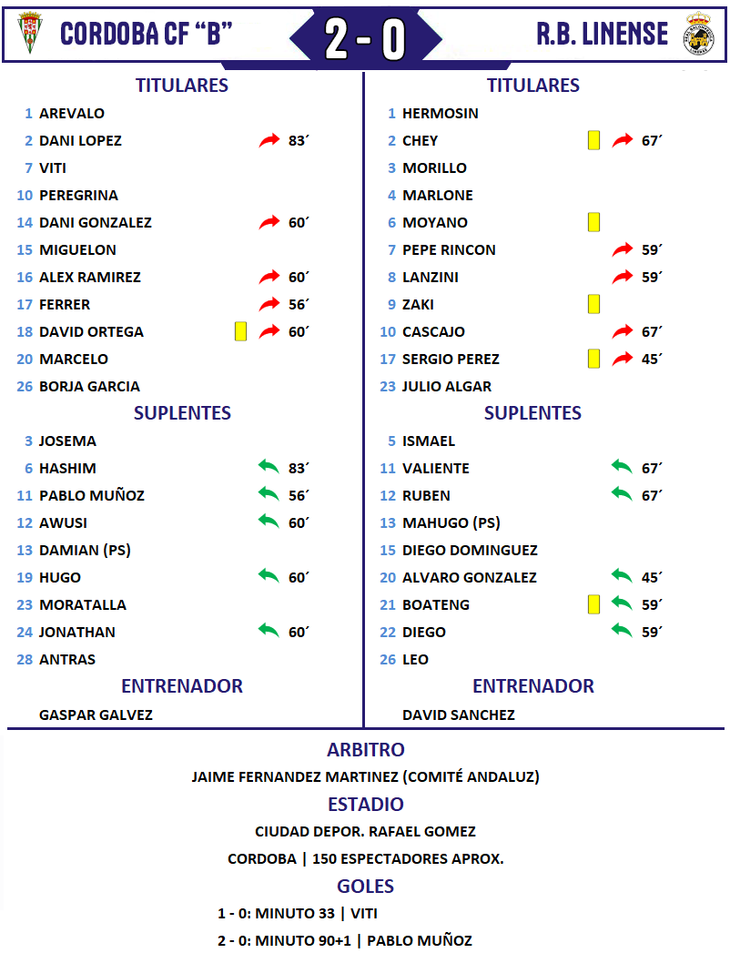 La Real Balompédica Linense regresó sin puntos de su enfrentamiento contra el Córdoba B, en su primer desplazamiento de la temporada, correspondiente a la segunda jornada en el grupo X de la Tercera Federación. La Balona cayó derrotada por 2-0 en un partido muy parecido al que brindó en el Ciudad de La Línea frente al Chiclana CF, sumando dominio durante los principios de cada una de las partes pero sin goles. En la segunda mitad, protagonizó más tiempo de juego, aunque sin sacar el provecho esperado y que todos desean, unas veces por la falta de acierto en los remates, y otras por la indecisión de algunos de sus jugadores para rematar o disparar a la puerta contraria. Puede quejarse de un gol anulado muy dudoso, pero en el cómputo general no estuvo acertado el equipo de David Sánchez
