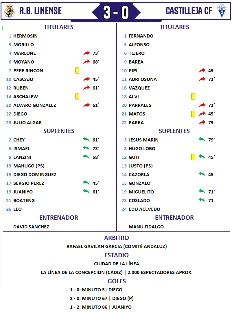 La Real Balompédica Linense ya carbura. El equipo de David Sánchez sumó tres puntos ante su afición y contra el Castilleja, su segunda victoria consecutiva de la temporada, en partido de la quinta jornada del grupo X de Tercera Federación. La Balona deja atrás la parte baja de la clasificación y empieza a mirar hacia donde todos desean, club, afición y plantilla, que no es otro sitio que los puestos de playoff de ascenso. Diego firmó dos goles -ya lleva cuatro- y Juaniyo remató con el tercero una tarde en la que, de nuevo, los albinegros dispusieron de muchas ocasiones para aumentar el marcador.
