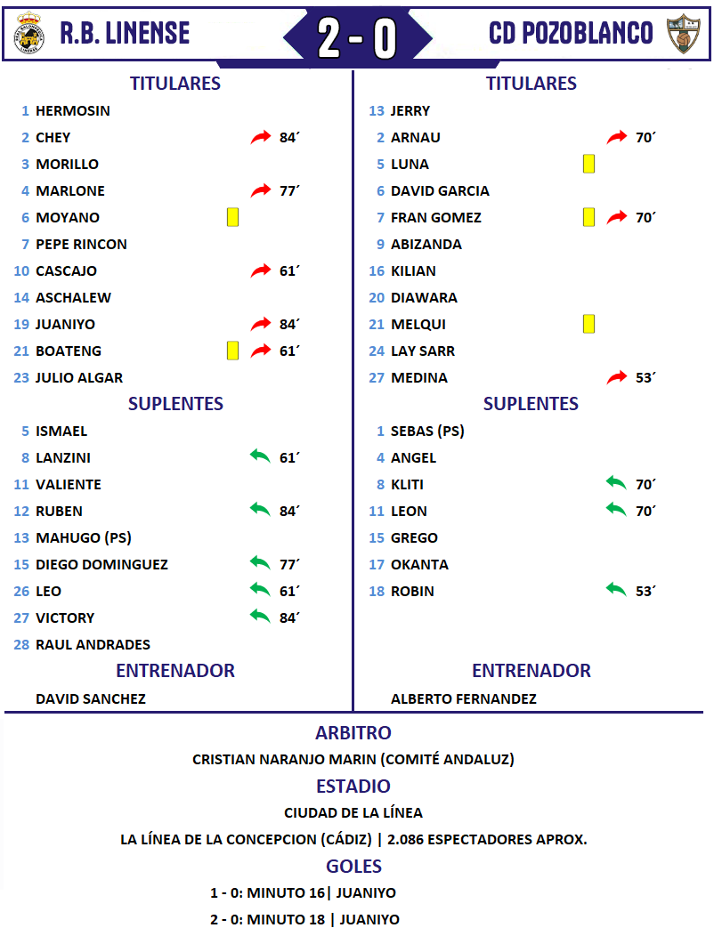 El chispeante comienzo puso a cantar al Ciudad de La Línea, que a la media hora vio como una doble ocasión merodeaba el tercero. Disparo que se fabricó Pepe Rincón y el rechace de Moyano que se marchó fuera por poco. El ataque estaba respaldado por el trabajo sucio de Adri Moyano y Boateng en la zona ancha, con una retaguardia que achicaba cualquier intentona de los pozoalbenses.