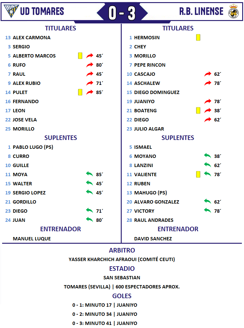 Juaniyo puso los goles y David Sánchez, el entrenador, puso el plan de partido correcto para que la Real Balompédica Linense consiguiera una nueva victoria, en esta ocasión frente a la Unión Deportiva Tomares, por 0-3, en partido correspondiente a la novena jornada del grupo X de Tercera Federación. La Balona dio un golpe de autoridad fuera de casa y escaló con este triunfo hasta la sexta posición, ya cerca de los puestos que dan derecho a jugar el deseado play-off de ascenso.