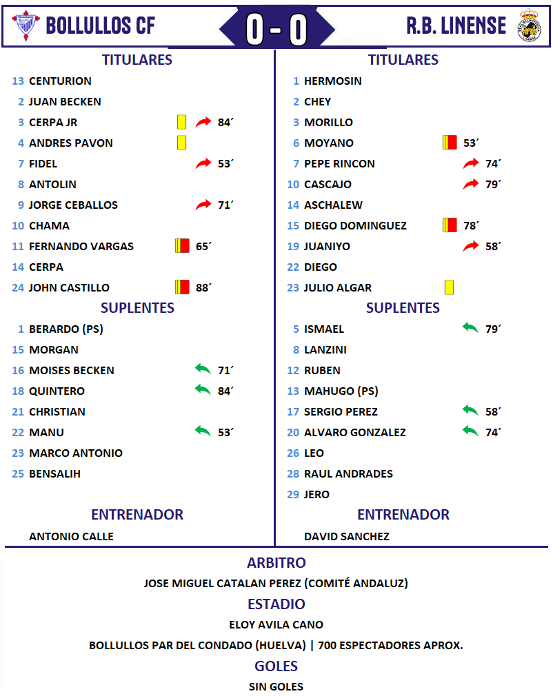 La Real Balompédica Linense saldó con un meritorio y valioso empate su visita al líder Bollullos. Los linenses, que se tropezaron hasta tres veces con la madera, estuvieron más cerca del triunfo, mucho más, que un rival que maniataron a base de orden, presión y trabajo hercúleo. Un partido competido, de lo mejorcito que se puede ver en esta raquítica Tercera Federación, pero que se encontró con uno de los infinitos adversarios propios de esta quinta categoría nacional: el arbitraje. De tan bajo nivel como la mayor parte de los que habitan en esta división. El sevillano José Miguel Catalán Pérez fue mutando a lo largo de la contienda hasta constituirse en lo que en el argot se conoce como pistolero y tarjeta va tarjeta viene dejó a los dos conjuntos con nueve futbolistas. Eso, en un partido intenso, de contacto, pero sin una sola acción de esas que hacen llevarse las manos a la cabeza. Vaya que nadie se tuvo que ir al hospital. Lo único bueno que se puede decir del trencilla es que puesto a repartir disparates, lo hizo con igual criterio para los dos bandos. Que ya es algo.