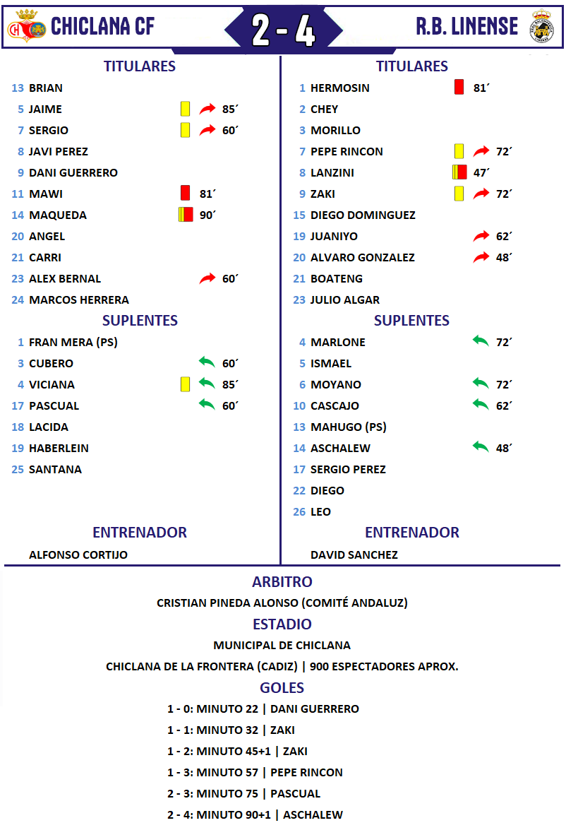 Los linenses, que habían salido sólidos, se desarregló un poco con el error. O el Chiclana se rehízo con el suspiro de alivio de ver que se había salvado por los pelos. Lo cierto es que en el 21′ tras una jugada en la que los visitantes enlazaron errores y algún resbalón inoportuno, llegó el 1-0, obra de Dani Guerrero (ex de Los Barrios).