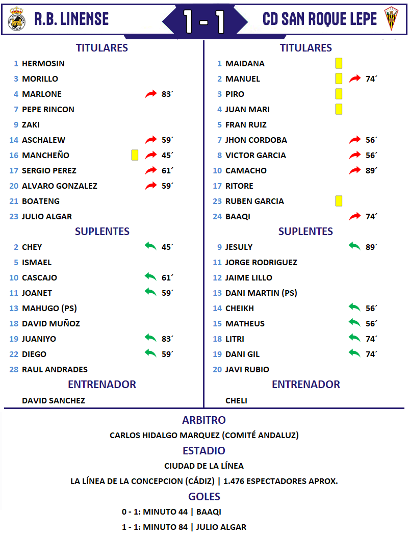 Una vez más salvada por la campana. Y es muy posible –a la espera de lo que diga la tele– que en esta ocasión también por un error arbitral, ya que es más que probable que la asistencia de Juaniyo a Julio Algar en el gol del empate llegase precedida de fuera de juego. La Real Balompédica Linense evitó su segunda derrota en el Ciudad de La Línea de la temporada, pero la estadística le recuerda que suma dos puntos de los últimos nueve. Es verdad que esta vez, por ocasiones sobre todo, estuvo más cerca del triunfo que el rival. Pero eso y nada, al final, es lo mismo.